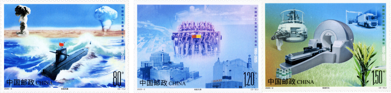 К 70‑летию атомной промышленности в Китае выпустили три марки. На одной изображена атомная подводная лодка, на второй — Циньшаньская АЭС, на третьей — гамма-нож, радиофармпрепараты, ускоритель, средства дозиметрии и досмотра. Это отражает применение ядерной энергии в медицине, безопасности, сельском хозяйстве и других областях.