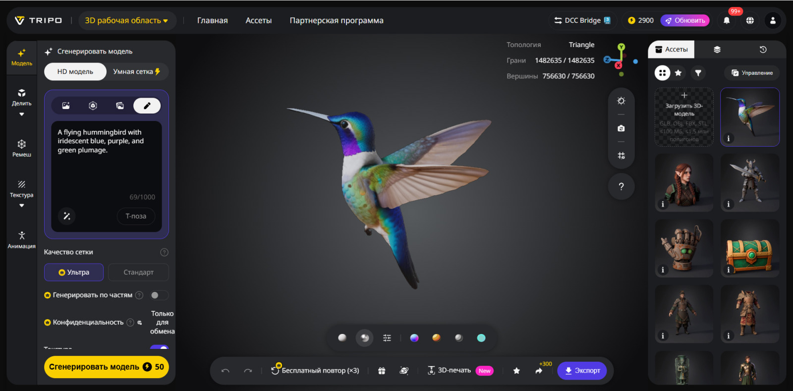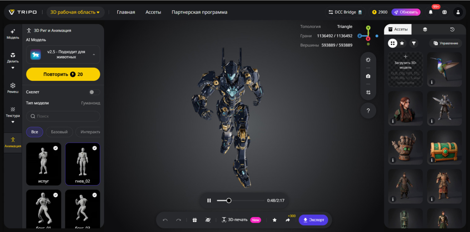 Для разных типов персонажей Tripo предлагает два режима риггинга: V2.5, оптимизированный для анатомии и движения животных, и V1.0, предназначенный для гуманоидных персонажей.