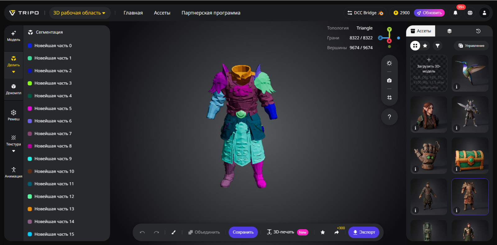 Сегментация моделей AI в Tripo превращает сложные 3D-ассеты в чётко определённые редактируемые компоненты. Интеллектуально определяя структурные границы внутри модели, система разделяет единую сетку на логические части, делая доработку, организацию и последующую оптимизацию значительно более эффективными.