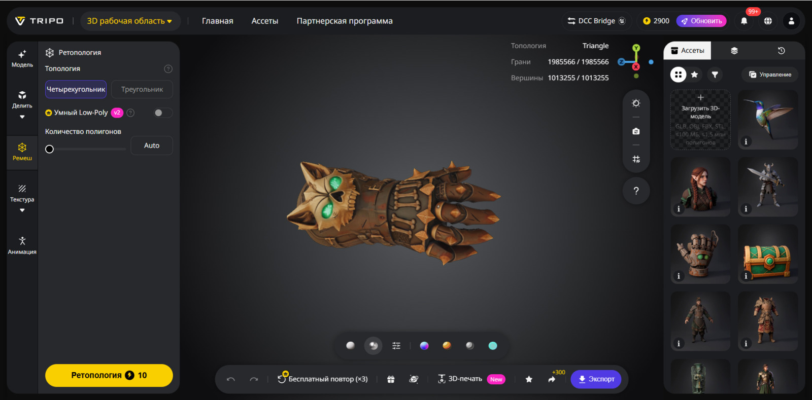 Функция Ретопология преобразует сложные или высокополигональные сетки в чистую, оптимизированную Топология, предназначенную для реальных производственных процессов. Перестраивая геометрию с равномерным распределением рёбер и уменьшенным количеством полигонов, система делает модели более удобными для редактирования, анимации и рендеринга.
