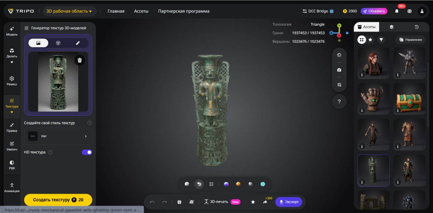 Одной из распространённых проблем AI-генерации является подход «всё или ничего»: результат либо подходит, либо нет. Система AI-текстурирование в Tripo, особенно инструмент Волшебная кисть, возвращает художнику творческий контроль. Вместо повторной генерации всей модели ради небольшой правки можно внести локальные изменения.