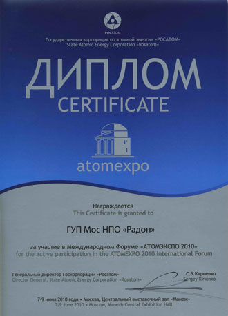 ГУП МосНПО «Радон» на своём стенде достойно представил уникальные технологии переработки твёрдых и жидких радиоактивных отходов и традиционно получил диплом участника.
