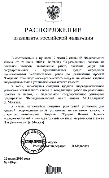 Распоряжением Президента России НИКИЭТ назначен единственным разработчиком такой реакторной установки. Это поистине инновационный проект, не имеющий мировых аналогов, ориентированный на осуществление масштабных программ по изучению космического пространства, на создание качественно новых средств высокой энерговооруженности.