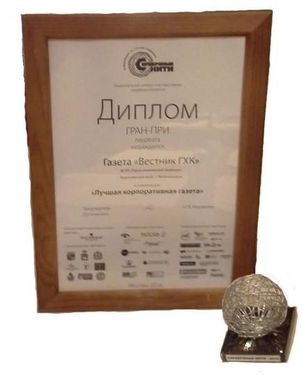 Корпоративная газета Горно-химического комбината (предприятие Государственной корпорации «Росатом, дивизион ЗСЖЦ) «Вестник ГХК» во второй раз стала обладателем серебряного клубка - Гран-при престижного конкурса «Серебряные нити-2014». Напомним, что впервые издание добилось этой знаковой награды в 2012 году, и теперь вновь подтвердило высокий уровень Горно-химического комбината, деятельность которого она освещает.