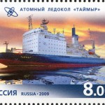 В 2009 году торгово-издательским центром «Марка» была выпущена серия марок, посвященных пятидесятилетию российскому атомному флоту. Марки выпущены были на листах по 8 штук с 2 купонами, также были выпущены и конверты. Оцените, кстати, оформление листов (дизайн — А. Дробышев).