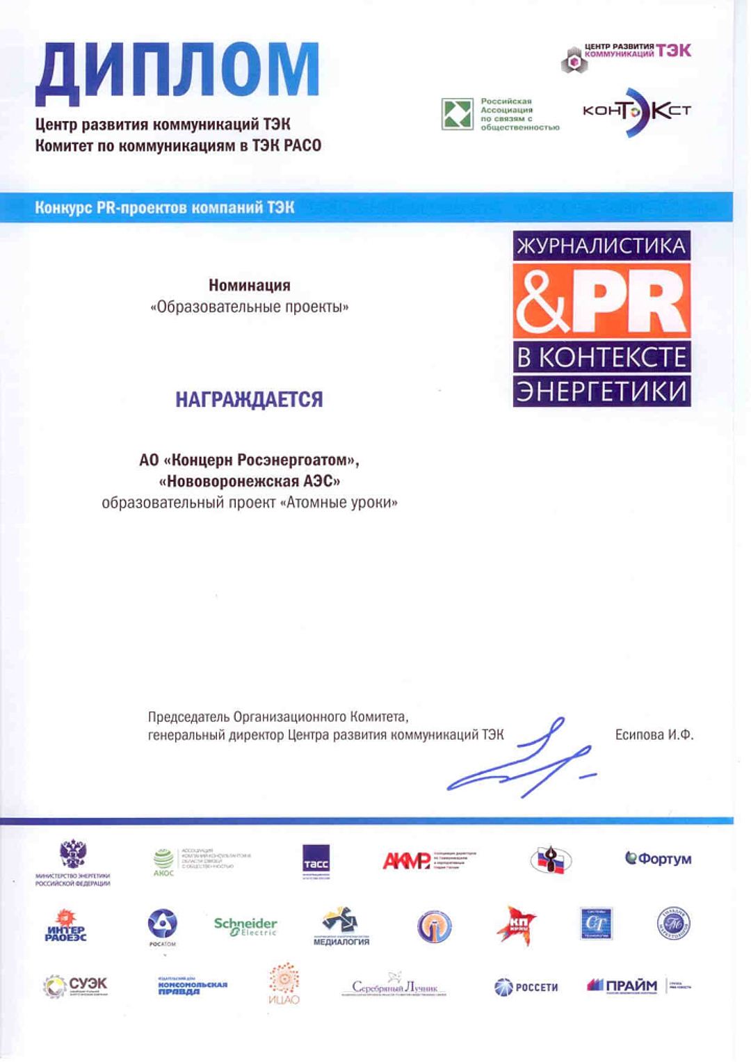 Проект Нововоронежской АЭС (НВ АЭС) «Атомные уроки» стал лауреатом конкурса «КонТЭКст», заняв второе место в номинации «Образовательные проекты», сообщили на предприятии.