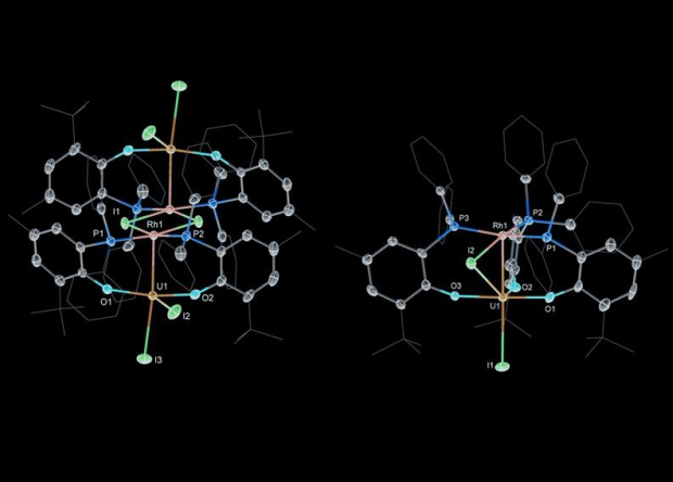 Авторы новой работы впервые описали соединения, в которых реализуются связи между ураном и родием — соседом кобальта и иридия по девятой группе таблицы Менделеева. Первое из соединений представляет собой мономерный комплекс, в котором уран и родий окружены «шапкой» из трех фосфорорганических молекул и одного атома иода. Во втором комплексе две пары уран-родий соединены между собой мостиковыми атомами иода. Оба вещества представляют собой зеленые кристаллы.