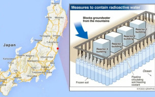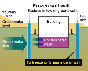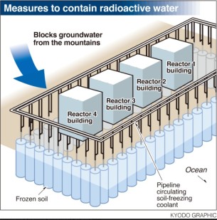 Оператор АЭС - электроэнергетическая компания Токио Дэнрёку ведет циркуляцию хладагента в трубах, помещенных в почву вокруг зданий реакторов, чтобы создать ледяной барьер протяженностью 1,5 километра.