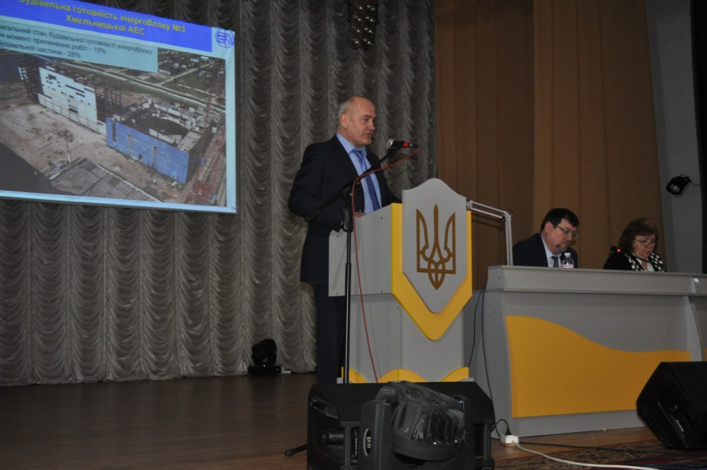 В своем докладе Олег Рахлинский рассказал об истории строительства; общем состоянии строительной готовности энергоблока на момент прекращения работ; результатами обследования технического состояния строительных конструкций, зданий и сооружений энергоблоков №3, 4, водоема-охладителя; состоянием выполнения ремонтно-восстановительных работ; наличием оборудования, находящегося на складах; предпосылками корректировки ТЭО энергоблоков №3, 4 Хмельницкой АЭС; а также мерами по повышению безопасности на новых энергоблоках.