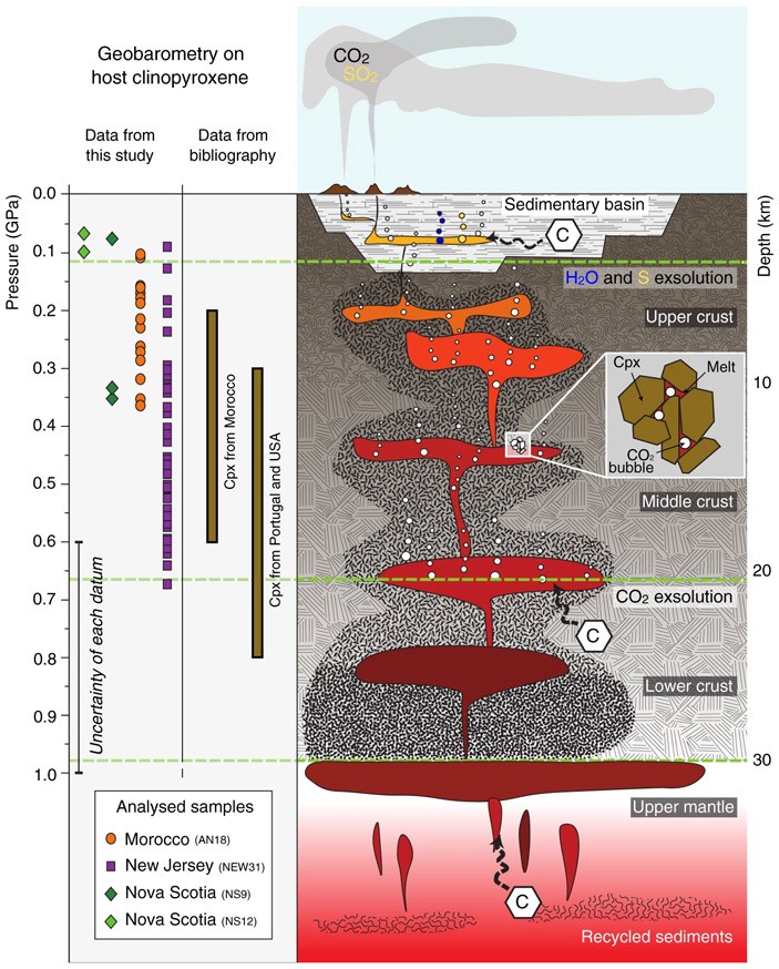 Для клинопироксенов базальтов САМР расчетное давление кристаллизации оказалось в диапазоне от 0,1 до 0,7 ГПа при температурах от 1150 до 1230°C, что соответствует условиям средней континентальной коры (глубина около 7–12 км). Отсюда авторы делают вывод о том, что весь СО2 в магмах САМР имел глубинное происхождение, а не был ассимилирован поднимающейся магмой из окружающих пород.