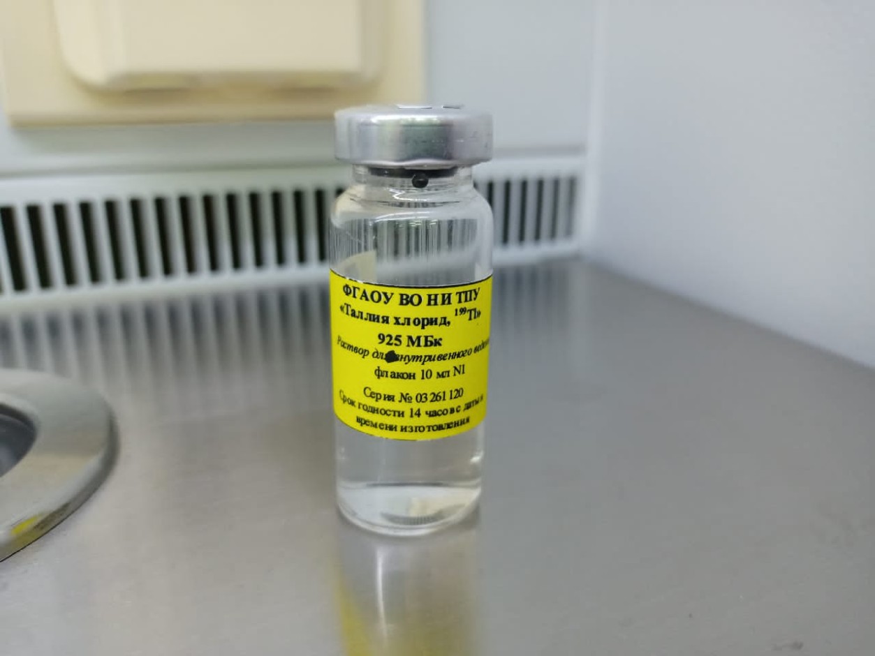 Каждый день в университете нарабатывают диагностический препарат фасовками по 925 или 1850 мегабеккерель (беккерель — единица измерения активности радиоактивного источника, ред.) таллия-199. Получают изотоп специалисты лаборатории радиоактивных веществ и технологий ТПУ на циклотроне — циклическом ускорителе тяжелых заряженных частиц. В циклотрон загружается мишень — тонкая пластина из золота. В течение нескольких часов ее бомбардирует пучок альфа-частиц. В результате чего в мишени происходит ядерная реакция, и образуется изотоп таллия-199. В НИИ кардиологии ТНИМЦ изотоп поставляется в форме физиологического раствора.