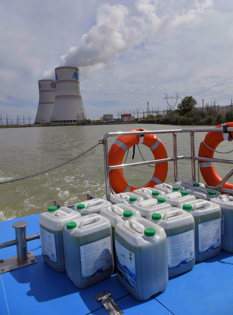Ростовские атомщики активно участвуют в очистке и восстановлении водных объектов страны. На днях в акватории реки Дон, где находится профилакторий Ростовской АЭС «Белая Вежа», специалисты впервые провели процедуру т. н. альголизации – они запустили в водоем 400 литров специального биоактиватора на основе планктонной хлореллы, которая сдерживает размножение сине-зелёных водорослей и предотвращает тем самым цветение воды.