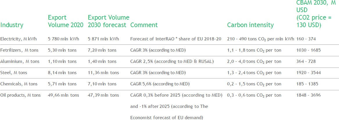 Объем экспорта для расчета сбора рассчитан на основе текущих значений 2020 года и официальных прогнозов МЭР. При этом для отдельных категорий (электричество, алюминий) были взяты прогнозы экспортеров. Расчет экспорта продуктов нефтепереработки также учитывает прогнозируемое сокращение рынка ЕС, связанное с ускорением энергоперехода.