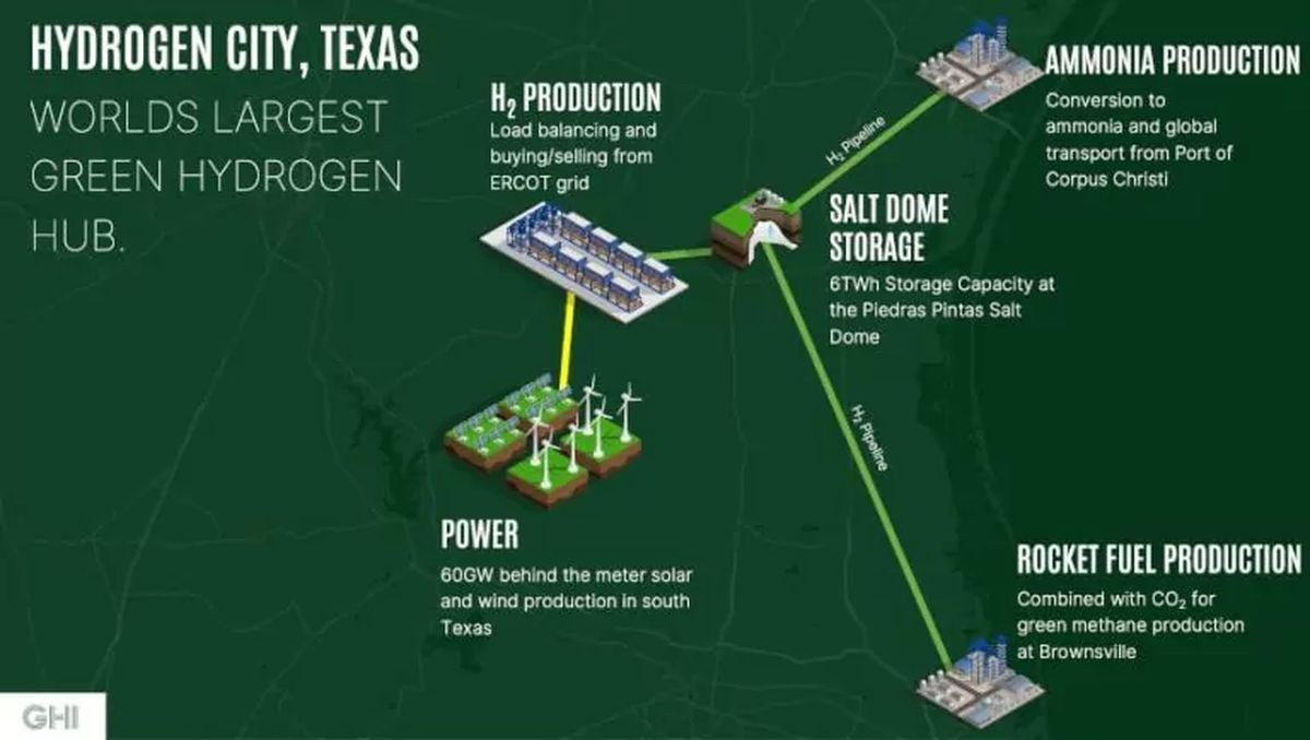 Водород, получаемый электролизом воды, можно физически хранить в соляных кавернах — искусственных полостях, вырытых в геологических соляных отложениях. Это объясняется тем, что соль обладает чрезвычайно низкой проницаемостью и пористостью, что гарантирует идеальную герметичность. Проект Hydrogen City будет расположен вблизи соляного купола Пьедрас Пинтас в Южном Техасе — идеальное место для хранения и распределения водорода. Трубопроводы будут использоваться для доставки водорода различным субподрядчикам, включая водородные электростанции, заводы по производству аммиака и ракетного топлива.