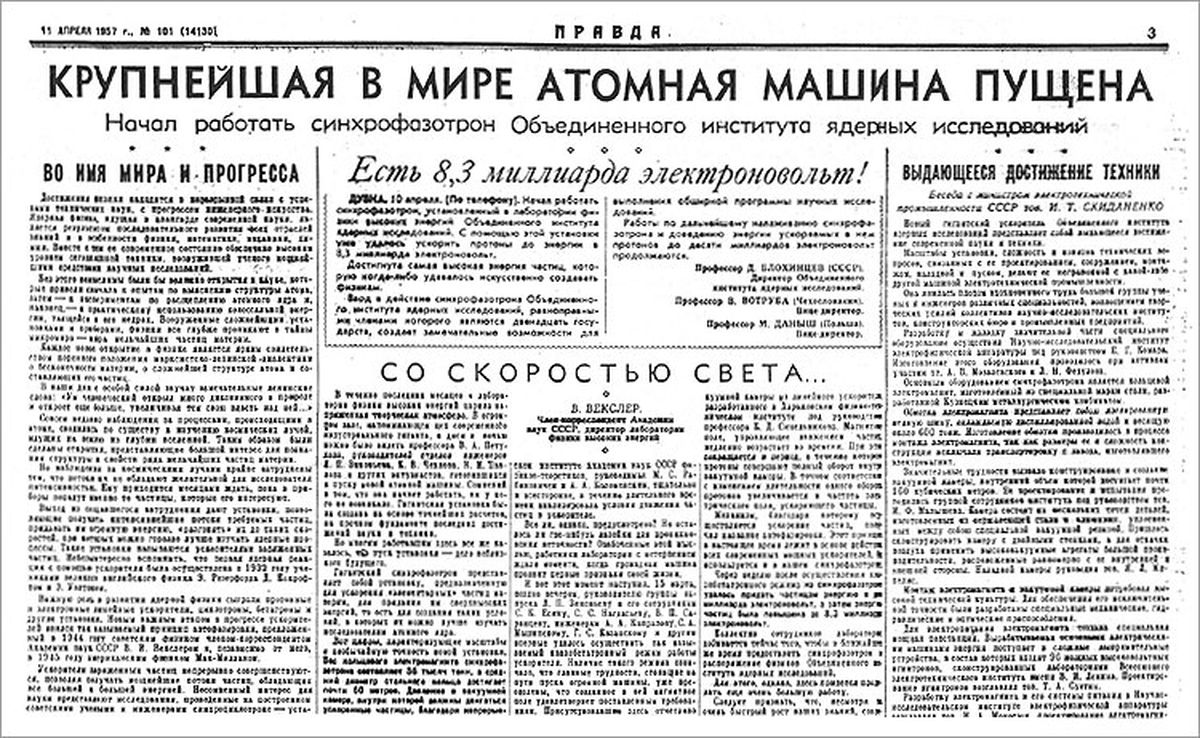 Об этом событии всему миру сообщила газета «Правда» 11 апреля 1957 года. Более поздняя дата обусловлена тем, что это известие появилось, лишь когда энергия ускорителя, постепенно поднимаемая со дня пуска, превысила энергию 6,3 ГэВ лидирующего в то время американского синхрофазотрона в Беркли. «Есть 8,3 миллиарда электронвольт!» — сообщала газета, извещая, что в Советском Союзе создан рекордный ускоритель.