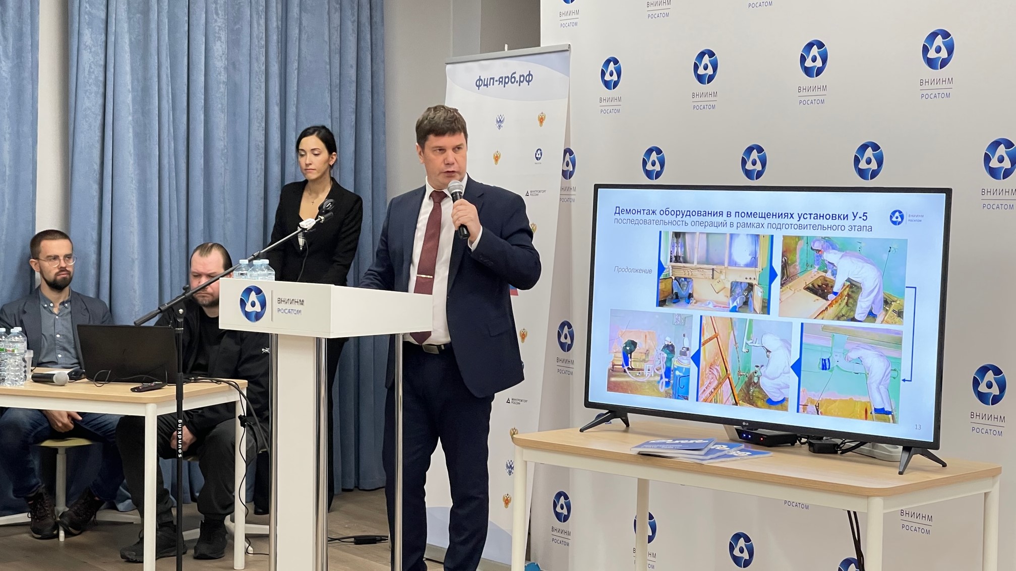 В рамках технического тура были представлены доклады об особенностях вывода из эксплуатации установки У-5 и компетенциях АО «ВНИИНМ» в данном направлении. Состоялось торжественное открытие реабилитированной территории.