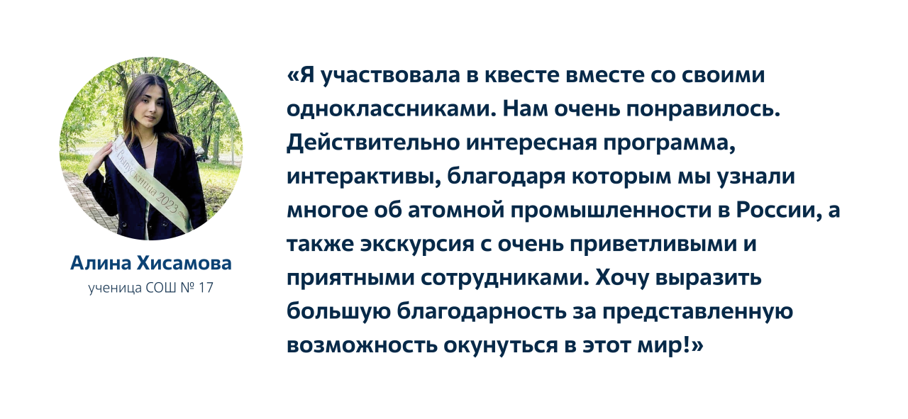 «Это хорошо сделанный и актуальный проект. Такие мотивационные мероприятия полезны для школьников. Они должны знать историю своего города, возможности, которые он даёт, знать о деятельности предприятий, не только работающих на мировом уровне, но и являющихся лидерами в своей сфере. Техническая академия Росатома именно такое предприятие. Профессионализм и уровень, на котором была организована "научная экскурсия" подтверждают это. Ребята активно участвовали в квестах, задавали ведущим вопросы. Большое впечатление на школьников произвели современные средства технического обучения персонала атомных станций. Было очень интересно и познавательно», - делится впечатлениями педагог-психолог МБУ "Учебно-методический центр" Лариса Брендакова.