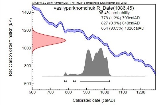 Калибровка радиационного возраста в календарный. Образец GV 02634 (целлюлоза, выделенная из торфа) интервал 93,8% составляет 864-1023 лет ADЕ.Пархомчук