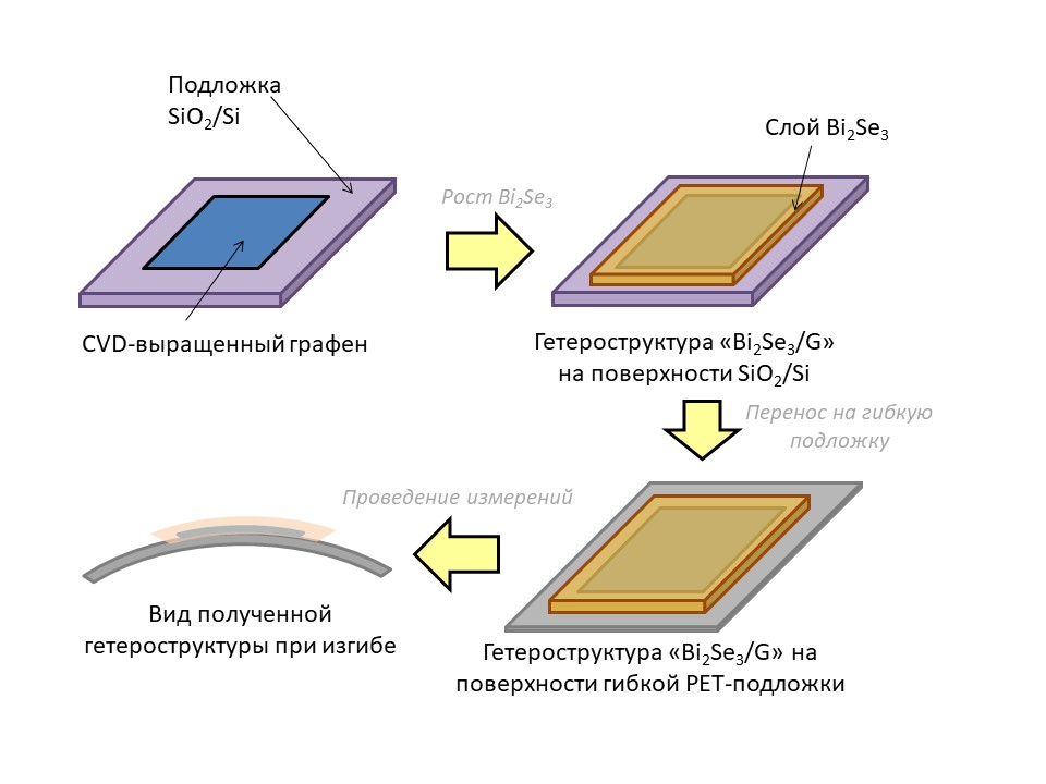 «Селенид висмута — соединение, известное как топологический изолятор. При осаждении из газовой фазы селенида висмута на графеновых пленках, он растет с более высокой скоростью и более высоким качеством пленки, по сравнению с ростом, например, на слюде. Такой слой, толщиной 20-40 нанометров, устойчив к механическим воздействиям: структуру можно согнуть до формирования прямого угла (радиус изгиба менее полутора миллиметров), и ее электрофизические характеристики сохранятся. Пленки Bi2Se3, осажденные на графене (в сравнении с пленками, выращенными на слюде и перенесенными на гибкую подложку) — более качественные, с низкой дефектностью, с хорошей границей раздела между слоями графена и селенида висмута.