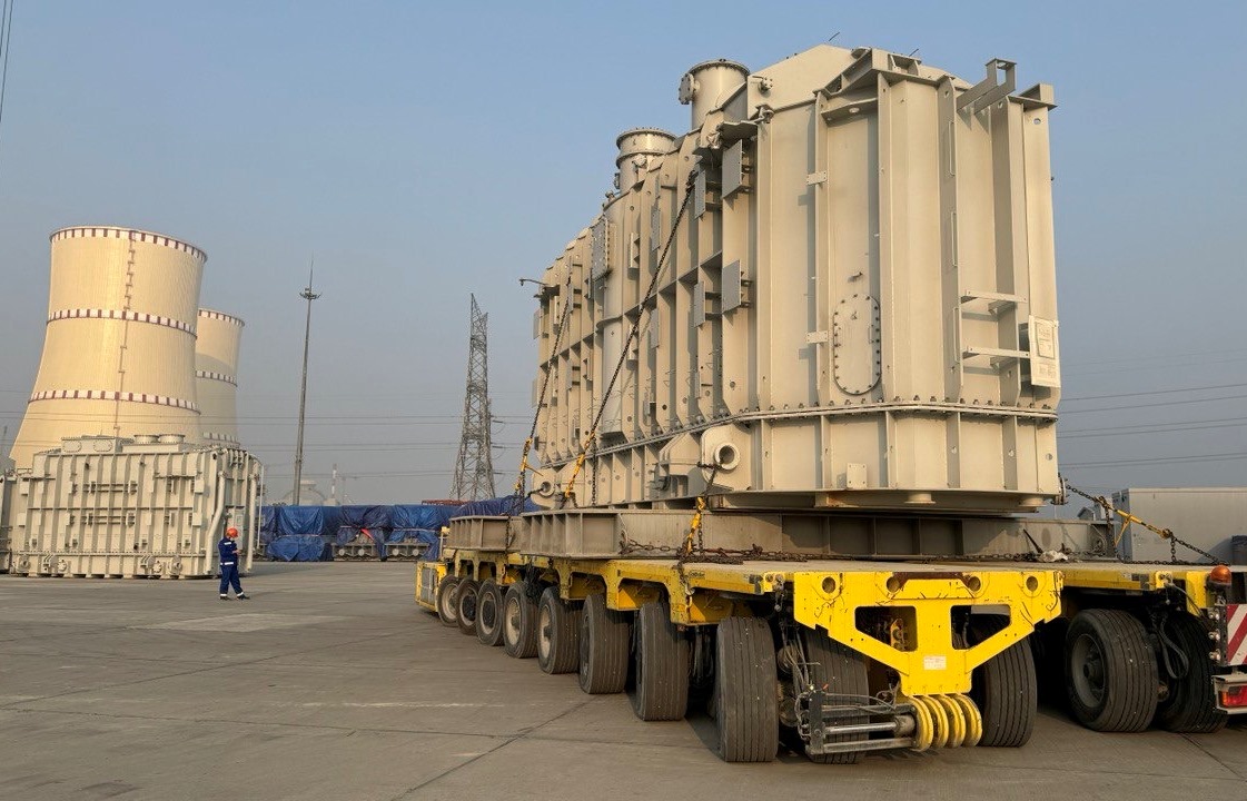 Силами участка специализированных работ (УСР) филиала в НРБ ООО «Корпорация АК «ЭСКМ» произведена перевозка с места временного хранения трех блочных трансформаторов ОРДЦ-533000/420 (весом 360 тонн каждый) и двух трансформаторов собственных нужд (весом 92 и 69 тонн) российского производства. Выгрузка оборудования портальной системой и установка на проектные фундаменты завершена успешно.