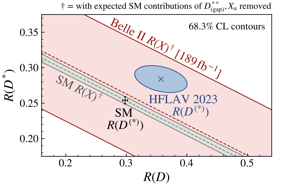 В новой работе физики из коллаборации Belle II измеряли отношение количества распадов В-мезонов в инклюзивные конечные состояния, в которых присутствовал тау-лептон, к количеству распадов с электроном или мюоном в конечном состоянии (R(X𝛕/𝓁)). Для этого они проанализировали 189 обратных фемтобарн данных, набранных в столкновениях электронов с позитронами в эксперименте Belle II с 2019 по 2021 год. Это соответствует приблизительно 198 миллионам пар В- анти-В- мезонов.