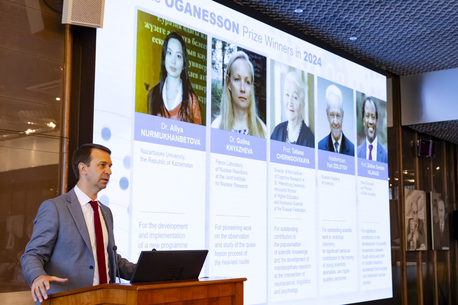 Директор ОИЯИ академик РАН Григорий Трубников, выступая на сессии Ученого совета, напомнил, что премия присуждается ежегодно за значимые достижения в теоретических и экспериментальных исследованиях в области физики, химии, биологии и прикладных задач, а также за творческую деятельность в области образования и популяризацию науки.