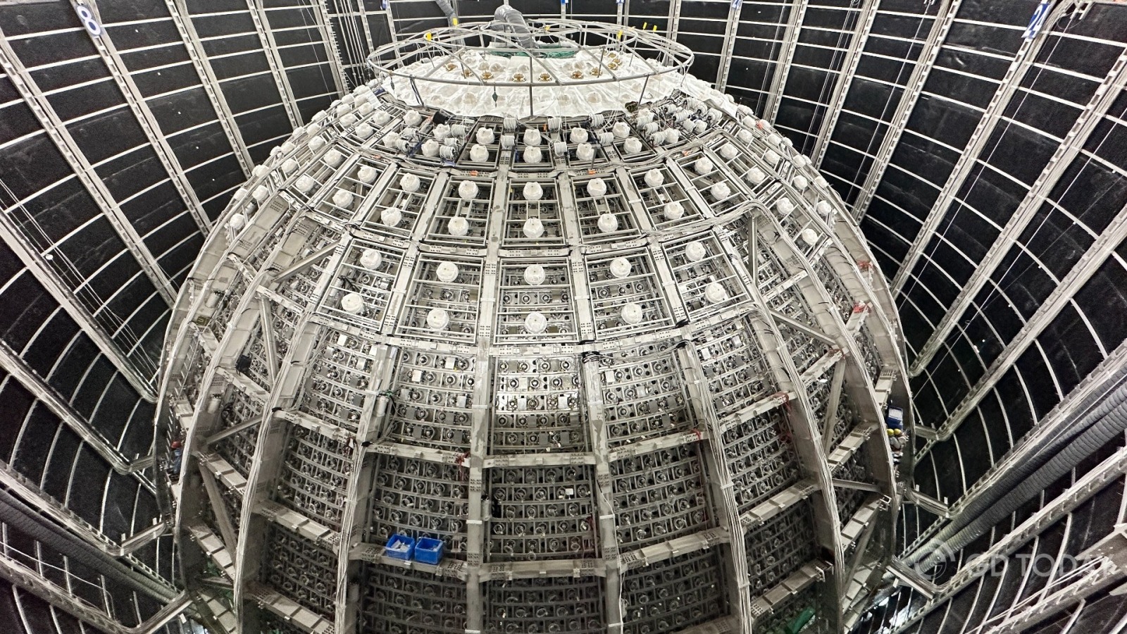 Китайские СМИ сообщили о завершении создания сферического детектора из акрила. Его диаметр достигает 35,4 м, а высота камеры с ним достигает 12 этажей. В детектор будет залито 20 тыс. тонн жидкости, которая будет вспыхивать при взаимодействии с проходящим через детектор нейтрино. Светочувствительные датчики на сфере измерят траекторию и энергию прореагировавшего с веществом нейтрино. И это будут достаточно редкие события. Хотя Землю и нас с вами непрерывно омывает поток разнообразных нейтрино — каждую секунду через сечение площадью 1 см2 проходит 60 млрд этих частиц — для взаимодействия нейтрино с веществом с вероятностью 50 % нужна стена свинца толщиной в один световой год.