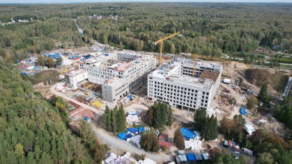 Сейчас на площадке идут работы по возведению главного здания и корпуса стационара. Все монолитные работы завершены, работы по фасадам и установке оконных рам подходят к концу. Запущена котельная, идет подключение к теплу корпусов.