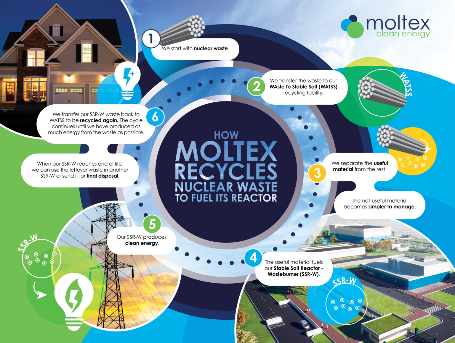 Извлеченные трансурановые элементы концентрируются для получения топлива на расплавленной соли, а продукты деления удаляются. Это значительно сокращает объемы отходов, но также преобразует ядерные отходы в чистую, управляемую энергию, навсегда устраняя долгоживущие трансурановые элементы, такие как плутоний, заявляет компания. В сочетании с технологией реактора Stable Salt Reactor-Wasteburner (SSR-W) компании Moltex, этот процесс позволяет создать замкнутый топливный цикл.
