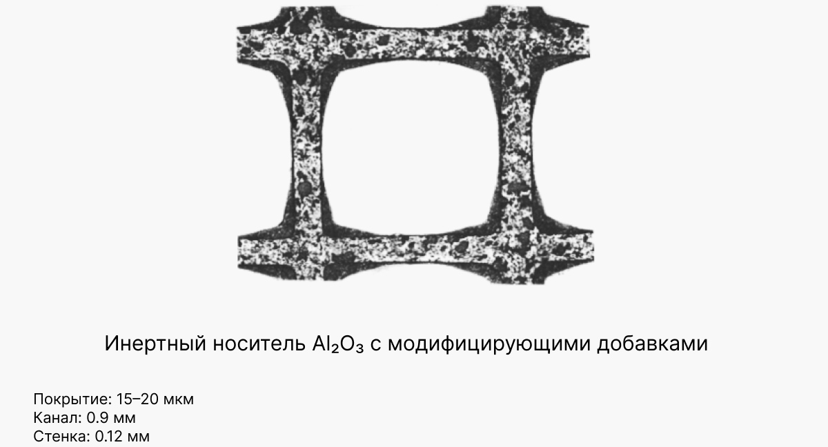 Ученые Института катализа СО РАН работают над усилением синергетического эффекта в каталитической активности платино-палладиевых систем в комплексе с оксидом марганца, нанесенных на алюмооксидное покрытие керамических блоков. Они смогли снизить содержание платины и палладия в катализаторе до 0.17 и 0.17–0.35 граммов на литр, соответственно, при 5-процентном содержании оксида марганца в алюмооксидном покрытии.
