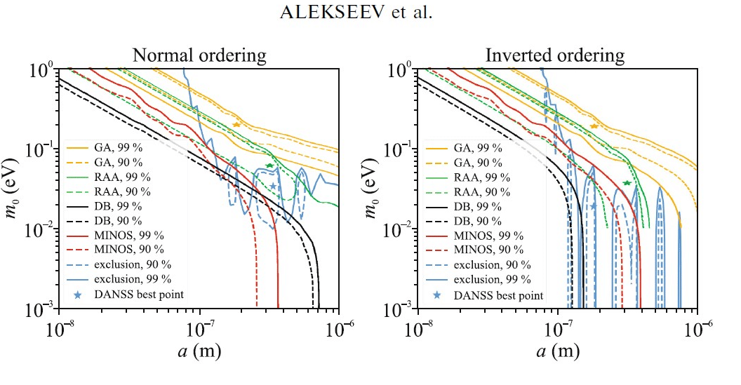 Исключение гипотезы о дополнительных измерениях как причине нейтринных аномалий. Этот график иллюстрирует главный вывод работы. На нем показаны области параметров (размер дополнительного измерения a и масса нейтрино m₀), которые могли бы объяснить галлиевую (GA, оранжевый) и реакторную (RAA, зеленый) аномалии. Синяя линия представляет собой «запретную границу», установленную экспериментом DANSS с достоверностью 99%. Так как эта граница проходит значительно ниже и левее «аномальных» областей, она полностью их исключает. Таким образом, DANSS закрыл возможность объяснения этих многолетних загадок физики с помощью простейшей модели дополнительных измерений