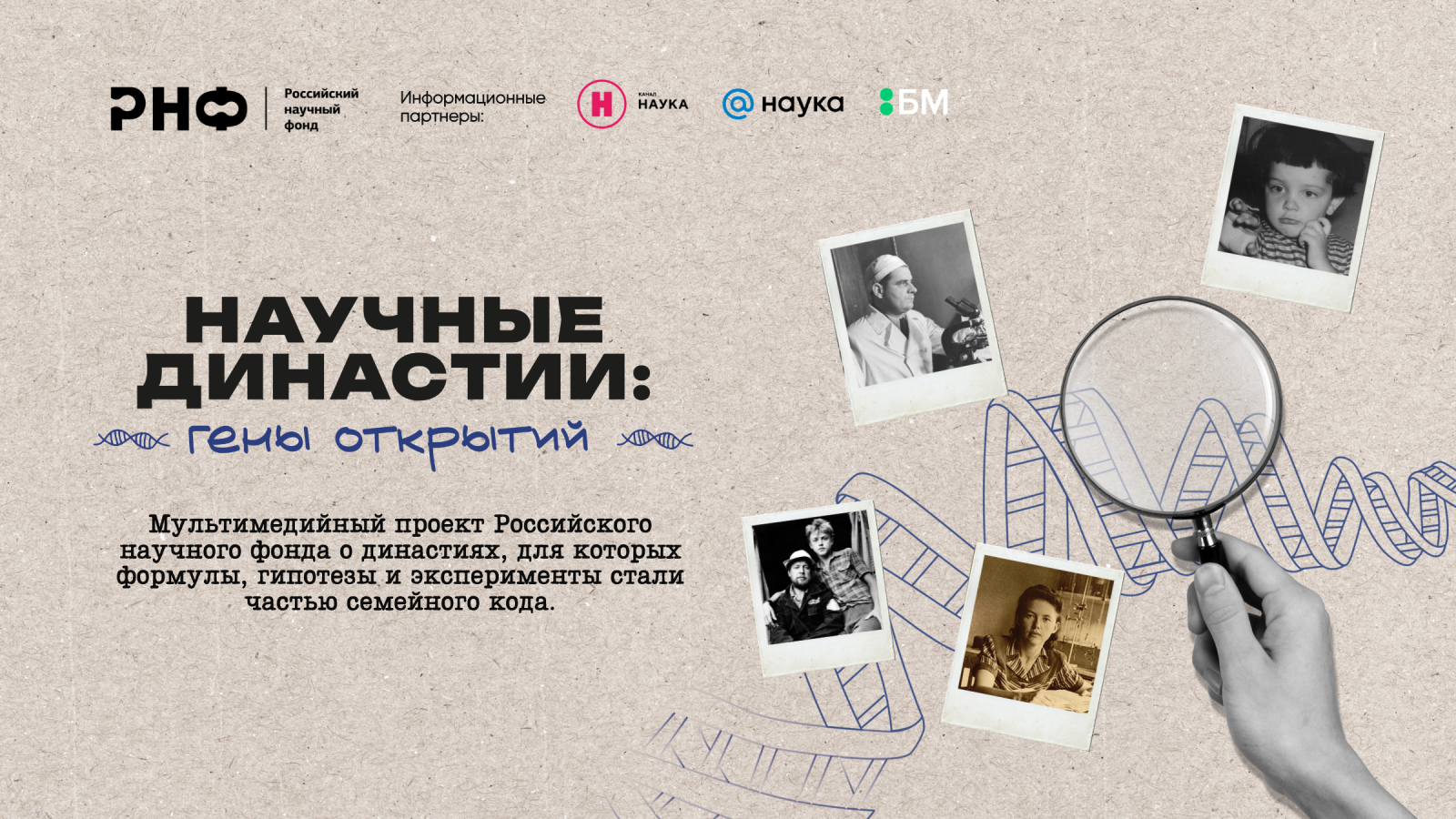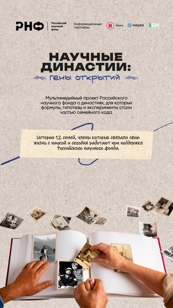 Российский научный фонд запускает мультимедийный проект «Научные династии: гены открытий» о семьях, для которых формулы, гипотезы и эксперименты стали частью семейного кода. Архивные фотографии и живые воспоминания, вплетенные в исторические события, позволяют по-новому взглянуть на прошлое и настоящее российской науки. Истории 12 семей, члены которых работают при поддержке РНФ, дают возможность проникнуться атмосферой науки, обычно скрытой от глаз общественности, — рассказы о подростковом бунте и первой любви, неудачах и радостях открытий, размышления о своем предназначении и беседы по работе за обеденным столом. Познакомиться с проектом можно на специальном сайтеexternal link, opens in a new tab Фонда.