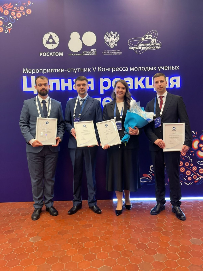 Молодые ученые ядерного центра: Александр Станкевич, Арсен Бакиров, Марина Бирюкова и Семен Шахмаев получили премию Госкорпорации «Росатом» в области науки и инноваций.