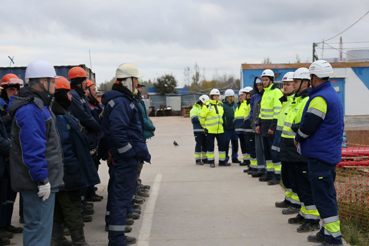 Особое внимание гостей привлекли утренние линейки безопасности в бытовых городках — обязательная ежедневная процедура для всех строителей холдинга «ТИТАН-2». Без её прохождения персонал не допускается к работе. Эта практика является неотъемлемой частью корпоративного стандарта охраны труда компании.