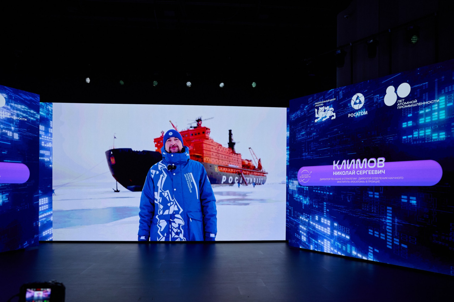Вопрос, посвященный тканевой инженерии, зачитал руководитель проекта «Биофабрикация» АО «НИИТФА» Егор Плахотнюк, а директор по науке и стратегии – директор отделения научного института «Росатома» в Троицке Николай Климов обратился к участникам викторины с вопросом о плазменных двигателях, записанном на борту атомного ледокола во время арктической экспедиции «Ледокол знаний» к Северному полюсу.