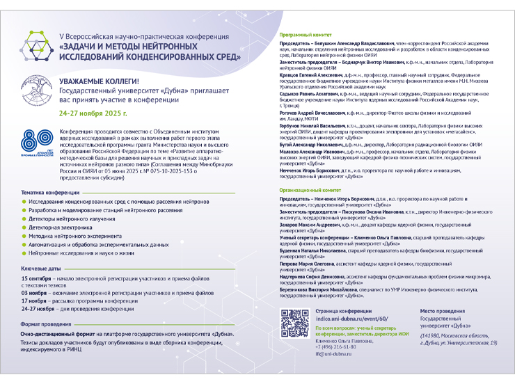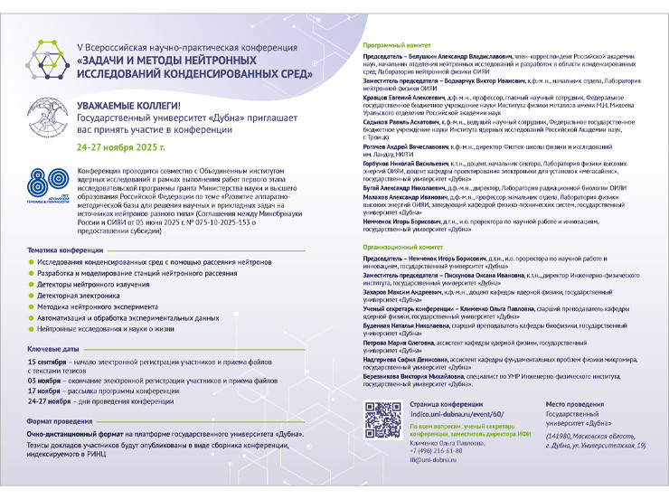 Государственный университет «Дубна» приглашает принять участие в V Всероссийской научно-практической конференции «Задачи и методы нейтронных исследований конденсированных сред», которая будет проходить с 24 по 27 ноября 2025 года в смешанном формате.