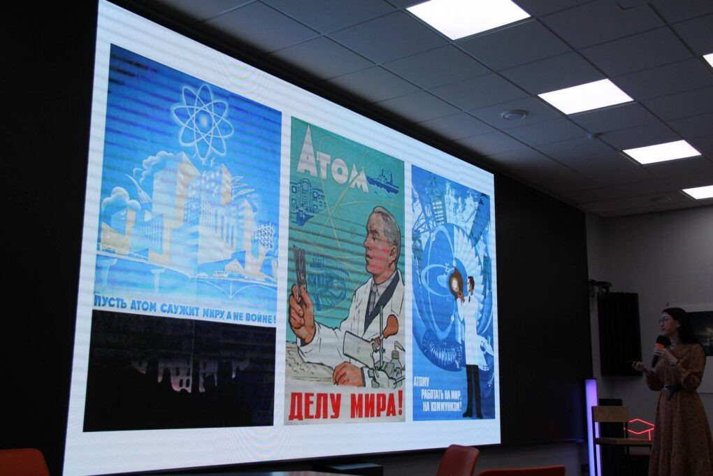 «Феномен “Ядерное искусство” (или atomic culture) – это направление искусства, сформировавшееся в 1950-х годах прошлого века как реакция креативного класса на использование ядерного оружия и атомной энергии, – объяснила спикер. – Одни впадали в пугающую эйфорию от открывшихся перед человечеством возможностей, другие воспевали мирный атом, но большинство предостерегало и напоминало о хрупкости нашего мира».