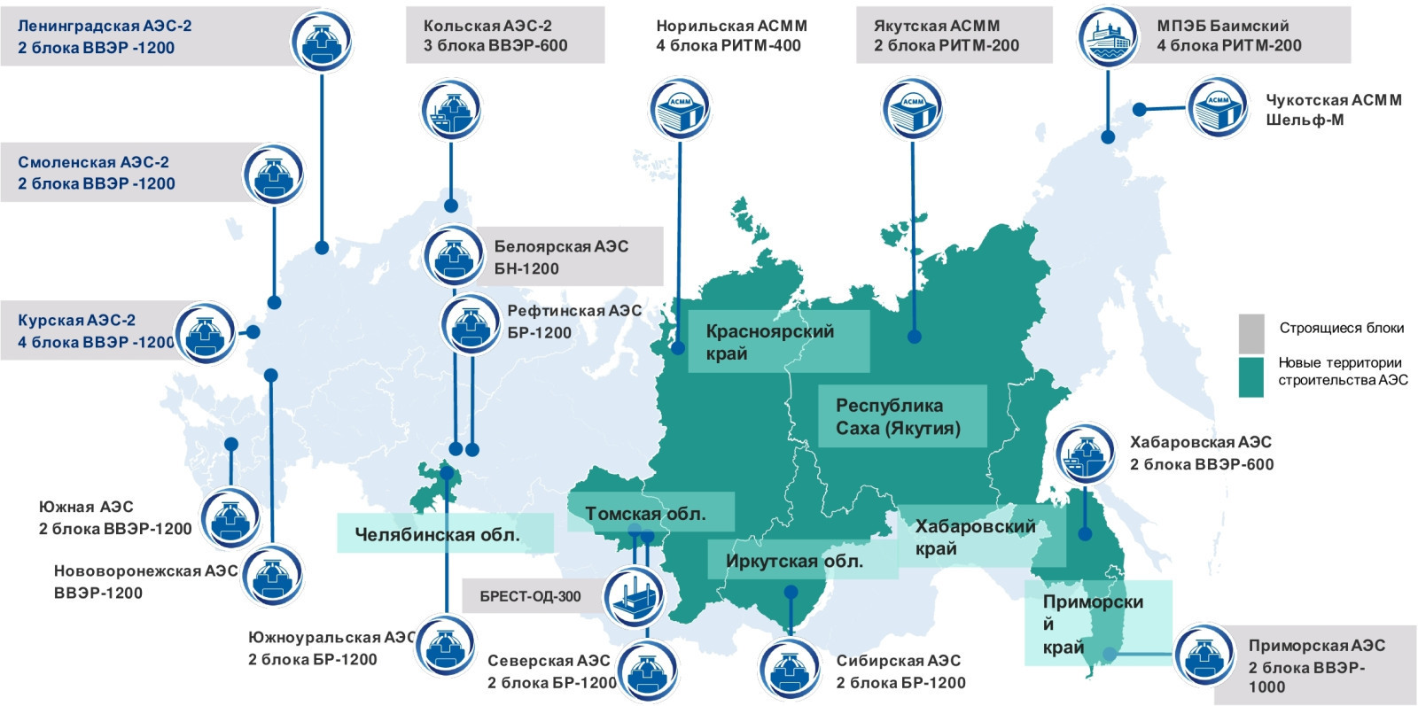 В начале 2025 года правительство утвердило генсхему размещения объектов электроэнергетики. В части АЭС документ предполагает, в частности, строительство Сибирской АЭС в Иркутской области с двумя блоками на 2,51 ГВт, Северской АЭС в Томской области на 2,51 ГВт, Южной АЭС на 2,4 ГВт, Приморской АЭС на 2 ГВт и Хабаровской АЭС (два блока на 1,2 ГВт). Также речь шла о четырех новых блоках на Курской АЭС-2 на 4,8 ГВт и двух новых блоках на Смоленской АЭС (2,4 ГВт), новом блоке Нововоронежской АЭС-2 на 1,2 ГВт, двух допблоках на ЛАЭС-2 (2,3 ГВт), двух на Кольской АЭС-2 (1,8 ГВт), а также о Южно-Уральской АЭС (2,51 ГВт).