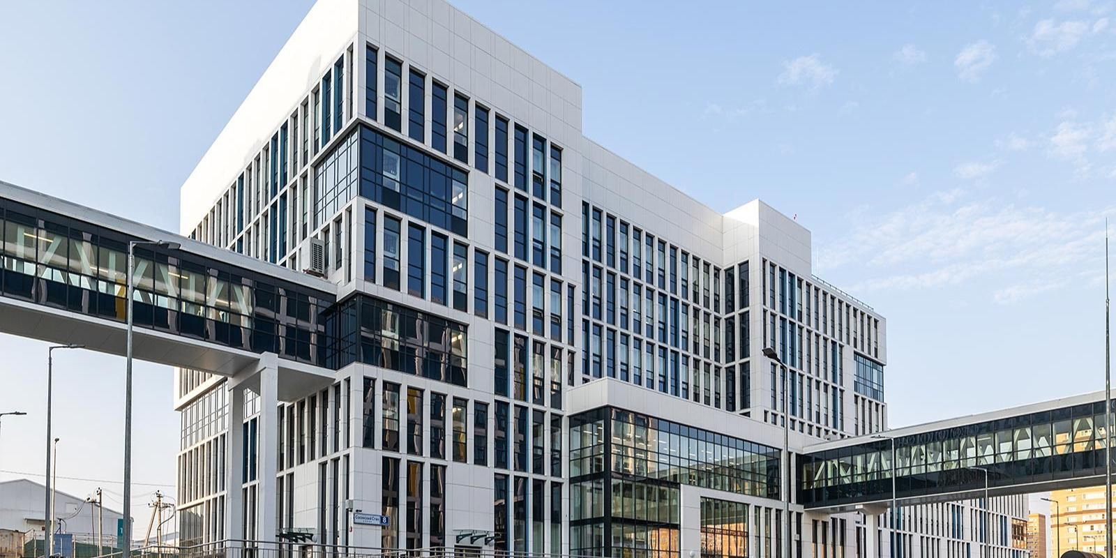Современный корпус общей площадью 12,9 тысячи квадратных метров построен с применением энергоэффективных материалов и технологий. Светлые фасады украсили синими панелями-вставками и архитектурной подсветкой.