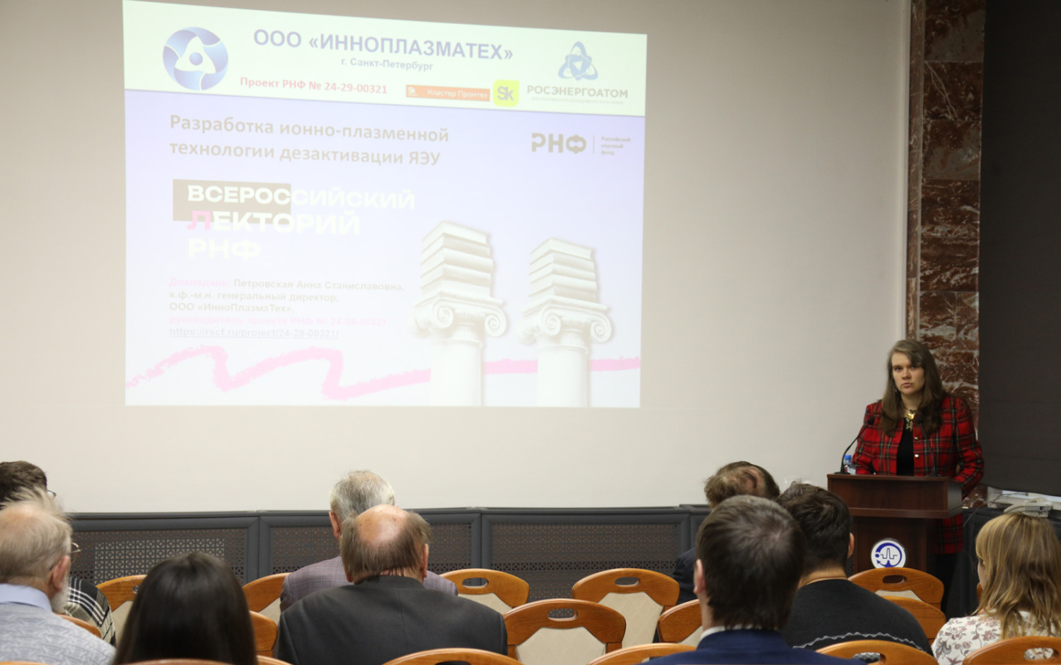 Двадцать третьего октября 2025 г. на базе ФГУП «НИТИ им. А.П. Александрова» в рамках Всероссийского лектория Российского Научного Фонда (РНФ) состоялся семинар, ключевой темой которого стал доклад кандидата физико-математических наук Анны Станиславовны Петровской «Разработка технологии ионно-плазменной дезактивации ЯЭУ». А.С. Петровская является руководителем гранта РНФ № 24-29-00321external link, opens in a new tab и генеральным директором научно-исследовательской компании «ИнноПлазмаТех».