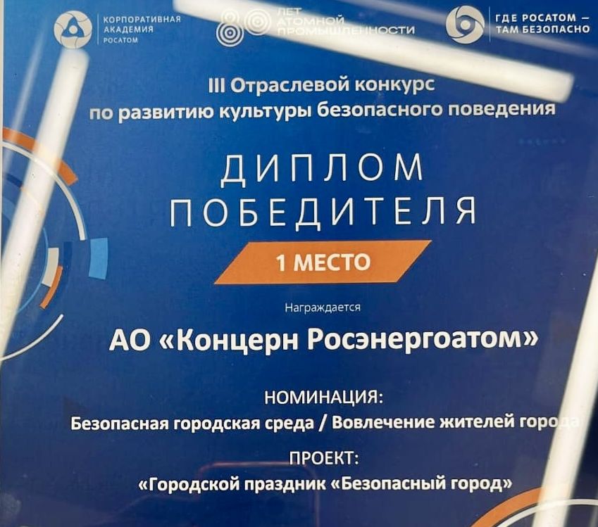 14 ноября 2025 года в Москве состоялась защита проектов-финалистов III Отраслевого конкурса по развитию культуры безопасного поведения. Проекты «Безопасный город» и «Цифровой контур - обучение под контролем», представляющие Концерн «Росэнергоатом», стали победителями в своих номинациях. В целом на конкурс поступило 82 проекта по 4-м номинациям.
