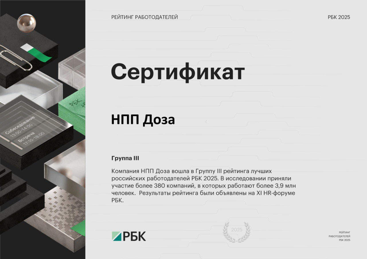 НПП «Доза» по итогам 2025 года признано одним из лучших работодателей страны, войдя в III группу ежегодного рейтинга работодателей РБК.