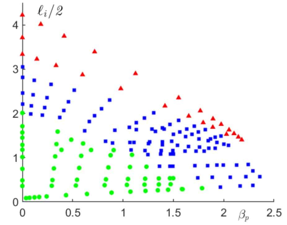 Ландшафт ошибки: навигационная карта для физика-термоядерщика. Эта диаграмма представляет собой «операционное пространство» токамака. По горизонтали отложено давление плазмы (βp), а по вертикали — параметр, характеризующий распределение тока (li/2). Каждая точка — это результат одного численного эксперимента. Зеленые точки (круги) — «безопасная зона», где ошибка стандартной формулы менее 15%. Синие точки (квадраты) — «зона предупреждения», где ошибка составляет от 15% до 40%. Красные точки (треугольники) — «опасная зона» с ошибкой более 40%. Эта карта наглядно показывает, что стандартной формуле нельзя доверять в режимах как с очень низким, так и с очень высоким давлением, а также при сильно сжатом профиле тока (большие значения li/2)