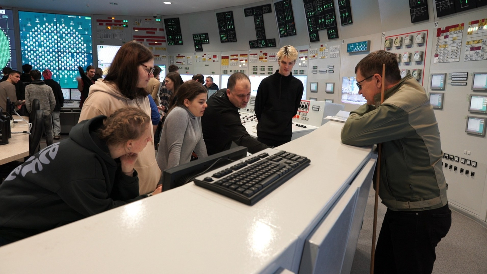 Знакомство с ядерными технологиями продолжилось на полномасштабном тренажере блочного щита управления, используемого для подготовки оперативного персонала. Этот уникальный объект особенно поразил и заинтересовал студентов.