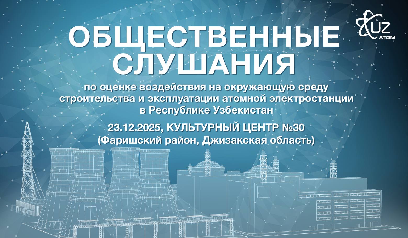 23 декабря 2025 года в 11:00 в Культурном центре №30 населенного пункта Богдон Фаришского района Джизакской области состоятся общественные слушания по проекту строительства атомной электростанции (АЭС) в Республике Узбекистан.