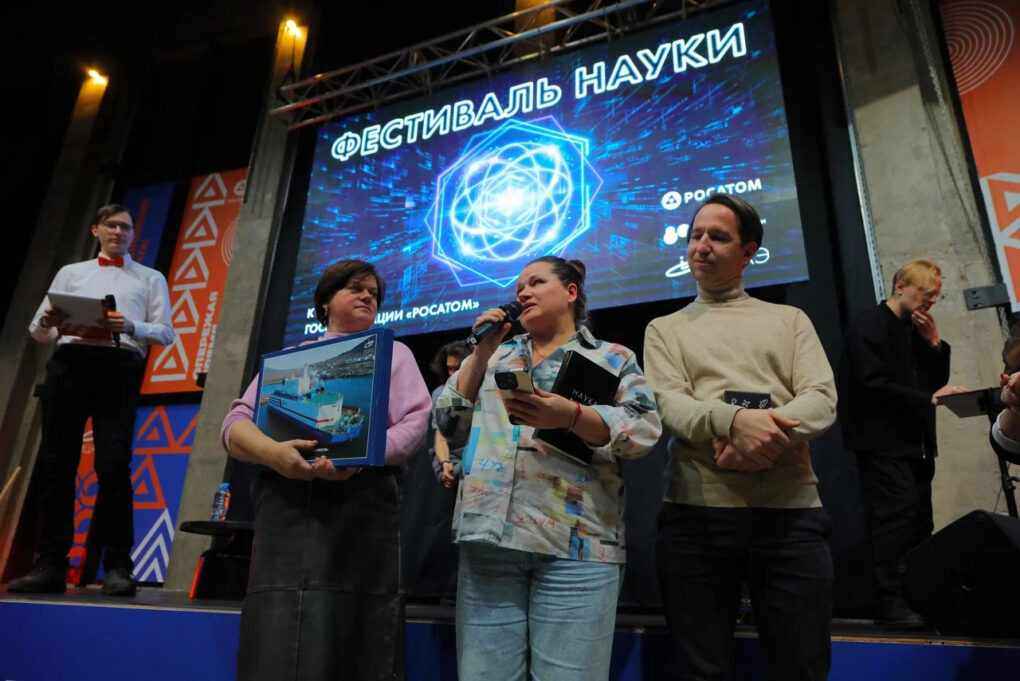 Вечерняя часть программы фестиваля началась с интеллектуальной игры «Адреналин» на тему «Атомные технологии», в которой нужно было не только правильно отвечать на вопросы, но и делать на них ставки, верно оценивая свои силы и знания, чтобы набрать как можно больше очков. Победителями стала команда «Три О», набравшая 1080 баллов.