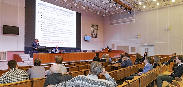 Заведующий лабораторией физики ускорителей МФТИ Юрий Филатов доложил об особенностях и возможностях режима спиновой прозрачности (ST-режим) для проведения экспериментов с поляризованными пучками на NICA. Этот режим, основанный на использовании соленоидальных сибирских змеек и спиновых навигаторов, позволит ускорять пучки без потери поляризации, управлять ее направлением и проводить высокоточные измерения. Ученый предложил методы экспериментальной проверки ST-режима на нуклотроне, а также объяснил преимущества быстроциклирующего инжектора формы-8, который способен обеспечивать поляризованными пучками не только коллайдер NICA, но и другие самостоятельные эксперименты. «Разрабатываемые в ОИЯИ технологии, позволят сделать ускорительный комплекс NICA уникальной площадкой для проведения высокоточных экспериментов с поляризованными пучками», – подытожил Юрий Филатов.