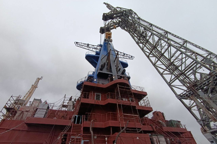 Специалисты Балтийского завода ОСК погрузили на строящийся атомный ледокол "Чукотка" мачту. Об этом говорится в сообщении предприятия от 11 декабря.
