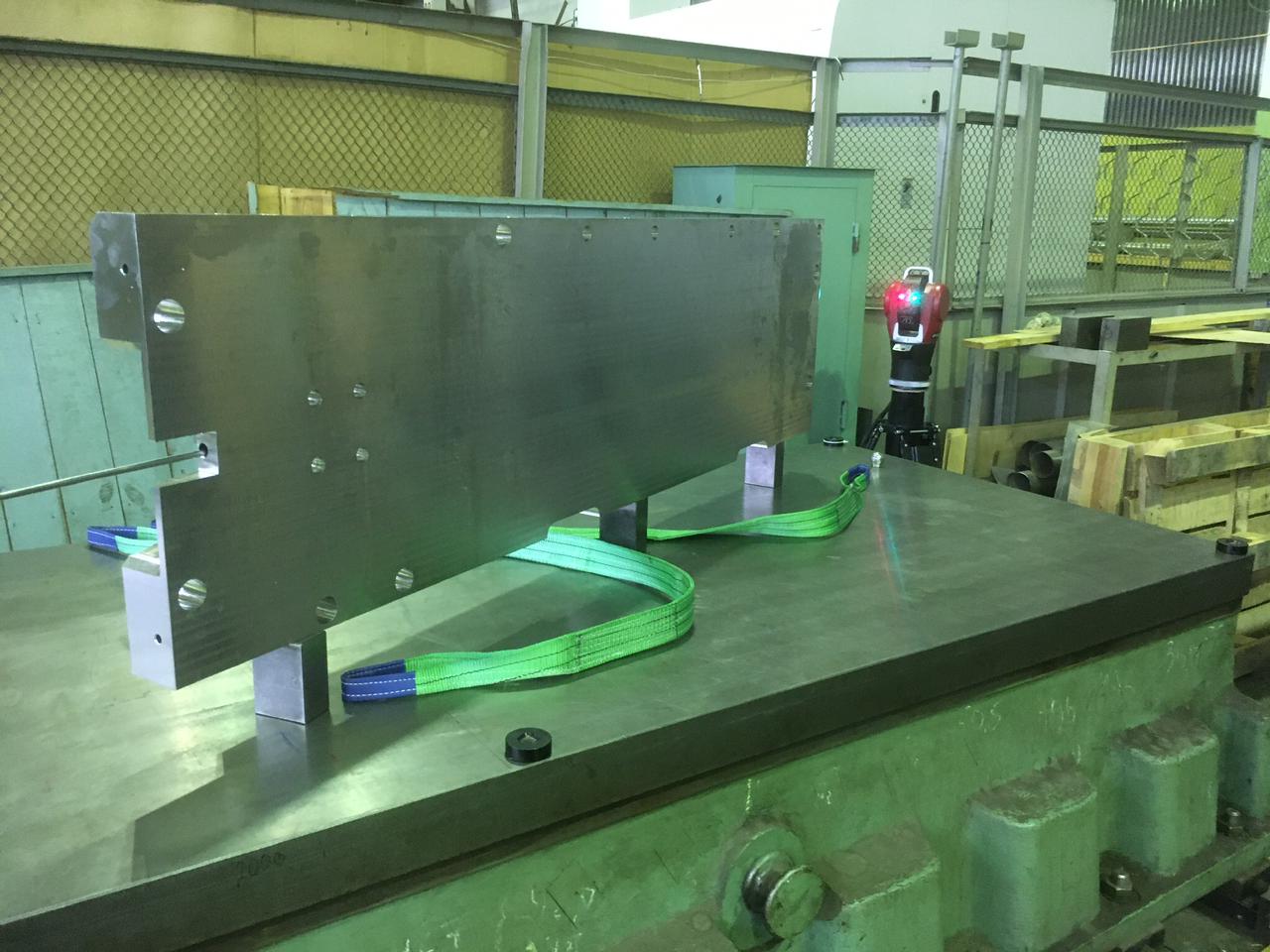 «Когда канал сквозной, нет никакой проблемы в том, чтобы взять телескопическую штангу и протянуть ее насквозь, с глухим отверстием все существенно сложнее, – добавил Дмитрий Гавриленко. – Для этого мы сначала размещаем элемент диагностического модуля в специальном помещении, с помощью лазер-трекера измеряем базовые поверхности для определения систем координат. После этого вводим в канал оптический калибр с закрепленным на нем уголковым отражателем, и с помощью лазер-трекера, установленного напротив канала охлаждения, с произвольным шагом фиксируем координаты точек отклонения от оси канала. Изюминка здесь еще и в том, что оптический калибр мы проталкиваем в глухой канал металлическим стержнем, а извлекаем с помощью прикрепленной к нему металлической уздечки. Претворить нашу идею в жизнь мы бы не смогли без помощи специалистов геодезической службы ИЯФ – Леонида Сердакова и Владимира Крапивина».