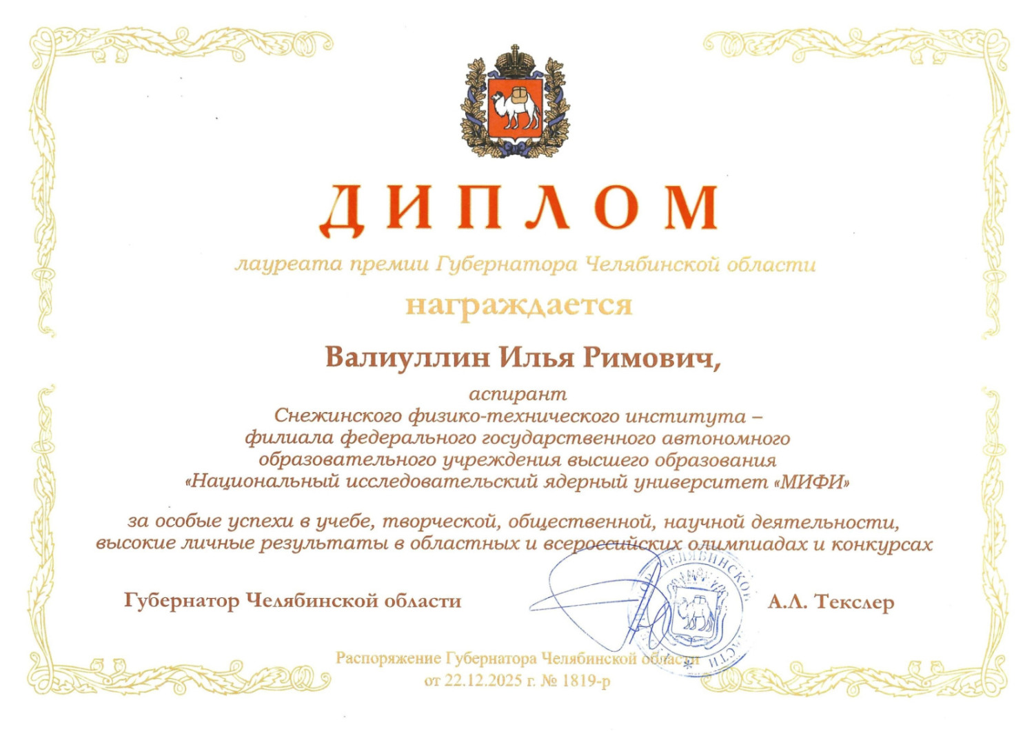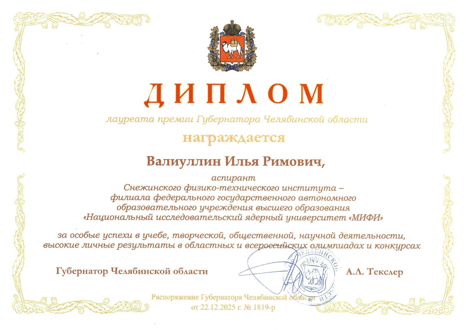 Илья Валиуллин стал лауреатом премии губернатора Челябинской области. Его отметили за особые успехи в учебе, творческой, общественной, научной деятельности, высокие личные результаты в областных и всероссийских олимпиадах и конкурсах.